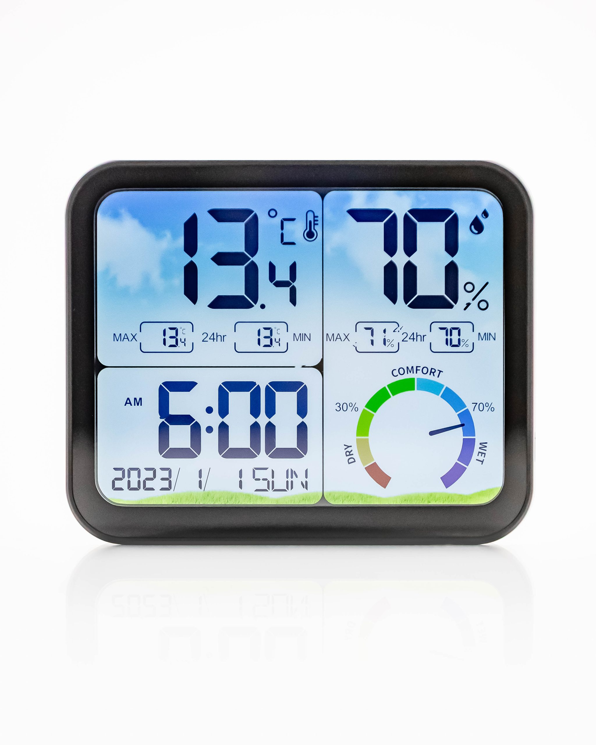 De hygrometer van YUCONN meet naast de luchtvochtigheid ook het temperatuur en met de 3 kleurenindicaties kun je in 1 oogopslag zien of de luchtvochtigheid te hoog / te laag of comfortabel is. Ook worden de tijd en datum weergegeven.