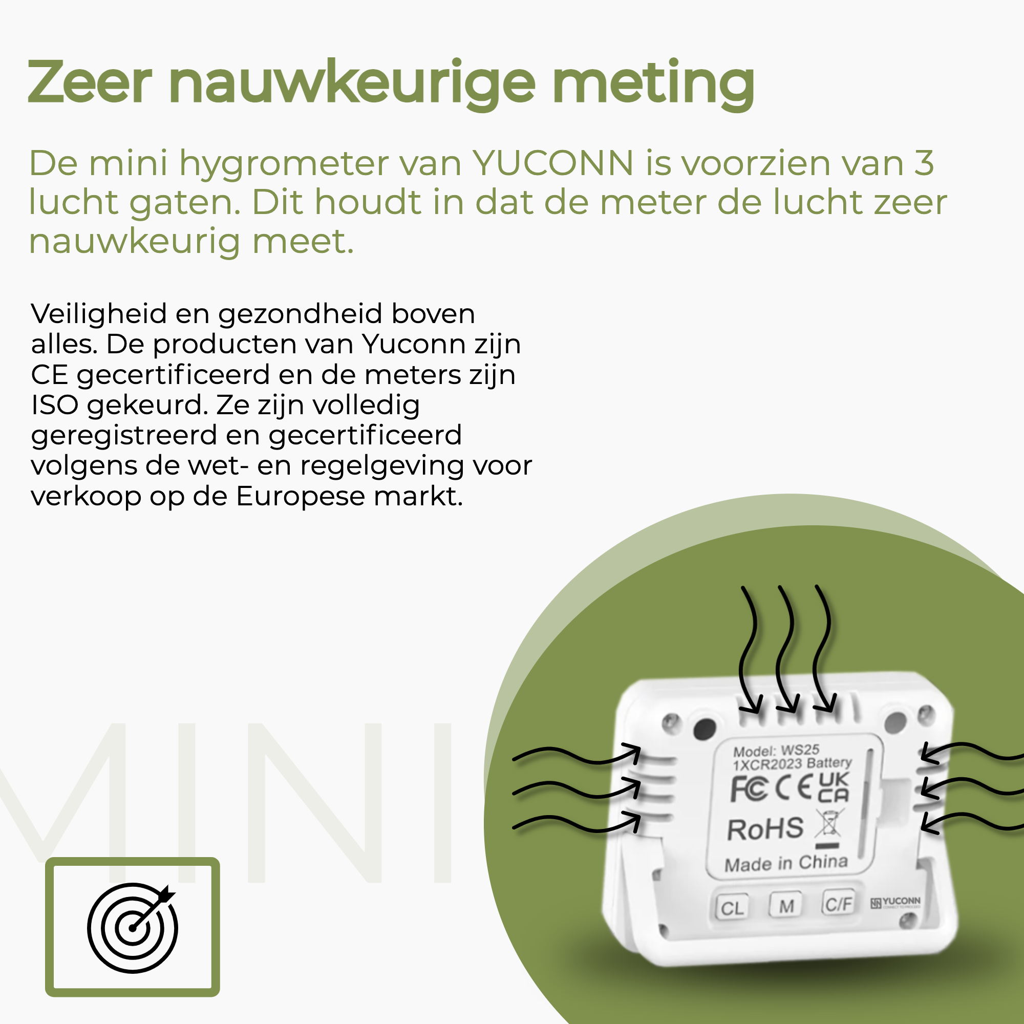 De sensor van de YUCONN YCN-25 biedt betrouwbare en stabiele metingen. Hij toont de temperatuur en luchtvochtigheid in realtime en helpt zo vochtproblemen, schimmelvorming of een te droge lucht vroegtijdig te signaleren. Zo kun je preventief maatregelen nemen, zoals ventileren of een luchtontvochtiger gebruiken.